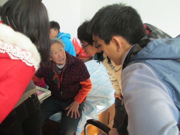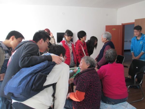 青协成员带着满满的热情和丰盛的礼品走进了老年公寓,为他们送去节日的问候。同学们有陪老人打牌下棋,有陪老人聊天回忆往事,还有同学教老奶奶跳健身操。通过交谈我们了解到,很多来到这里的老人都是因为老伴去世后,不愿给儿女增加负担,而选择来到这里,我们的到来给他们平淡的生活增添了许多活力。在即将离开之际,一位老奶奶吸引了我们的注意。她曾是哈工大三公寓的楼管阿姨,听说我们是工大的学生后,与我们合影留念,我们约定常回来看看。