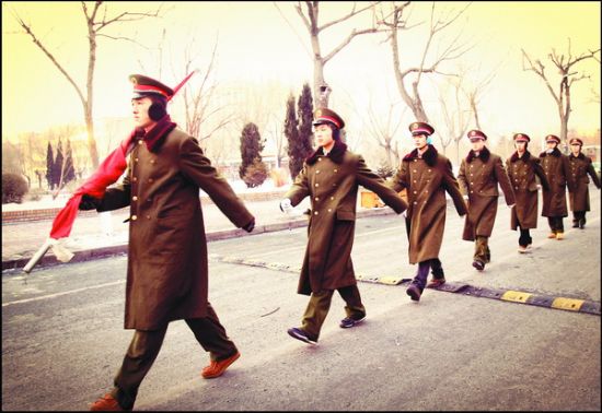 任何奉献都是苦中作乐,升国旗也是如此:因为国旗广场离公寓比较远,6:15就得准时从公寓门口出发,借着东方的一点微亮队员们以最饱满的姿态向那一方神圣的土地进发,路上还是有一些晨练的同学的。因为冬天的早晨天特别冷,寒风直往裤管里灌,刺骨的寒意迅速传遍全身,刮在脸上更是像刀刮一般难忍,很快双腿就像冰过一样冻得僵直,每踢出一步全身都在用力。尤其是擎着国旗的那支手更是冻得要命,因为套国旗的杆是一个钢管,握在上面就像一排排针刺在手上,并且整只胳膊要保持不动,常时间这么坚持着根本就没了知觉。但肩上的国旗告诉他们:这是一项神圣的使命,就算是再困难也要坚决完成任务!在挂旗的时候手一直在不停的抖,是寒冷,还是激动?此时义勇军进行曲奏响,将国旗用力的向空中挥去,这鲜红的一抹红色迎着朝阳冉冉生起,此时的他们热血沸腾,像一团火向上涌动,每拉动一下绳索,他们的心都会为之一颤,就在这一瞬间仿佛像是有了一次空间瞬移,像是学生们就站在天安门广场的旗杆下,他们就是那一个个庄严豪气的男子汉!回去的路上,虽然身上早已冻得的失去了知觉,但是心中的那团烈火还在熊熊的燃烧!此刻他们就是战士,就是最可爱的人!