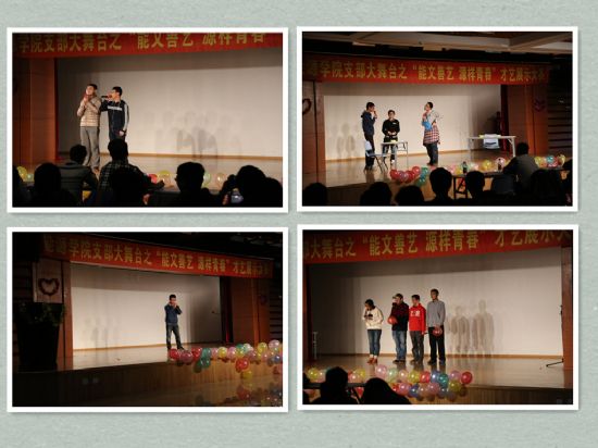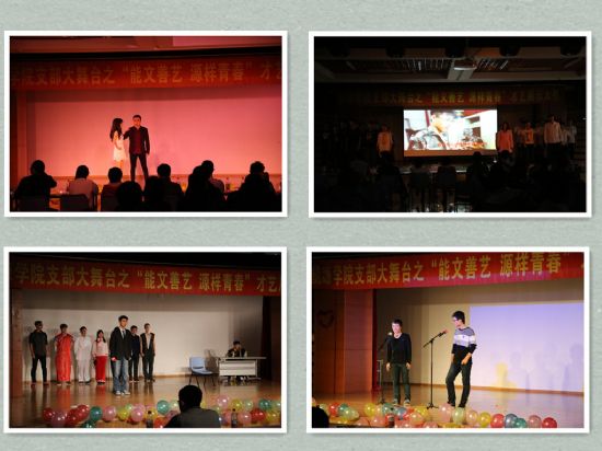 的祝愿。热烈火辣的拉拉队舞蹈过后,大赛正式开始。参赛的不仅有个人,更有刚刚熟悉起来的集体;涉及的表演形式除了舞蹈、歌曲串烧,还有相声、舞台剧和话剧,真可谓是精彩纷呈,令人称赞。个人表演的选手用精彩的表演展示着自己,而配合熟练的集体表演则展现出团结协作的精神。精彩的展示之后评委现场评选出各类奖项,最后,主持人宣布获奖节目并致谢幕词,大赛圆满结束。