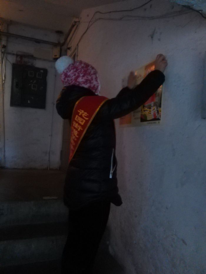 活动前期,负责人通过与社区干部电话联系,确定了活动时间、地点和需要准备的物资。20日下午两点半,志愿队的同学准时到达了花园社区,与社区干部进行了汇合。在社区干部的带领下,同学们进入了住宅区,给居民进行了文明社区的宣讲,在楼道里粘贴了宣传海报。