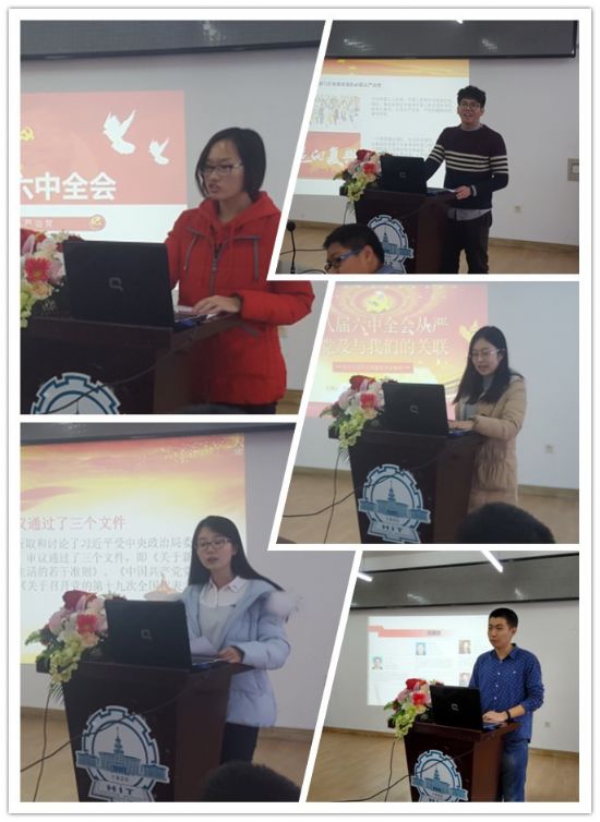 本期讲坛主题为“十八届六中全会——从严治党”,五位主讲人分别围绕主题进行了精彩的演讲。其中,胡伟轩同学从十八届六中全会与我们的关联讲起,谈到了“中华民族的伟大复兴”,强调只有从严治党,建立铁的纪律与规矩,杜绝一切形式的腐败行为,才能全面提升党员的行为素养,让我们的党焕发生机与活力,真正建立起一个强大的祖国;刘丹同学从十八届六中全会的会议背景及内容出发,论述了会议的时代背景、重大意义及会议内容,着重介绍了会议审议通过的三个文件,强调了“以习近平总书记为领导核心”的方针以及从严治党的必要性,并号召大家学习;王可欣同学从全面从严治党方面出发,主要介绍了党在反腐倡廉行动中的工作与成果,用民众对反腐的满意度说话,充分体现了从严治党以来党中央行动的积极性与决心。同时就“如何做一名合格的共产党员”,号召党员勇于承担责任,贡献力量;赵亚芬同学结合从严治党的实际作用,谈了党员应有的自我修养、党保持活力的根本要素以及贪污腐败的危害,强调了“蝇贪泛滥,其害如虎”,表示了全面从严治党的必要性;最后,郄志鹏同学首先谈论了《永远在路上》,从苏荣、周本顺、周永康等“大老虎”的忏悔中,强调了“从严治党”的重要性,着重指出我们党员应该保持自身的先进性,做一名合格党员。