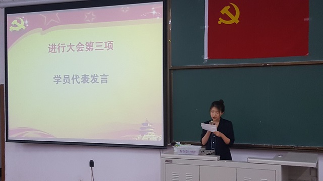 伴随着庄严的国歌,本次积极分子培训班开学式正式开始。首先,主持人介绍了本次积极分子培训班的基本情况,课时安排等具体事宜。来自人文学院15级的学员杨萱同学代表发言,她代表本次培训班等积极分子庄严承诺会认真学习党的方针路线,端正入党动机和学习态度,并以党员的标准严格要求自己。