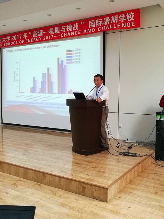 (罗昭君/文)7月17日上午9:00-10:30,美国明尼苏达大学Roger Ruan教授为学员们作了关于微波辅助生物质的催化与转化的专题报告。他讲解了当今化石燃料的应用现况并过渡到生物能源发展的大好前景,由现今的常规热解方法和气化技术过渡到微波辅助技术,基于这些介绍背景,教授介绍了新型反应器的开发并介绍了反应器各部分的功能。在报告的最后,教授为学员们介绍了关于合成气的相关知识。通过这次报告,很多学员表示对新能源的现今和前景有了更为深入的了解,同时也激发了大家对生物能源的学习热情。