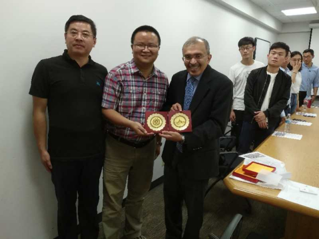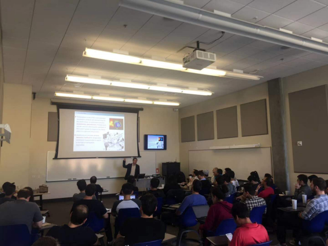 第五站是加州大学-默塞德分校UCMerced,访问团受到了机械工程学院MaYan-Bao教授和Sun Jian-Qiao院长及其他机械工程系教授的亲切会见。在座谈中,Sun教授逐一了解了每位博士生的研究领域,并对当前UCMerced机械工程学院的教学和科研等各个方面进行了详细的介绍。会谈结束后,齐宏教授受邀为UCMerced教师和研究生作了关于火焰温度非接触测量的专题报告。在提问环节,UCMerced师生就报告话题积极与齐宏教授探讨,讨论氛围激烈,学术气息浓郁。