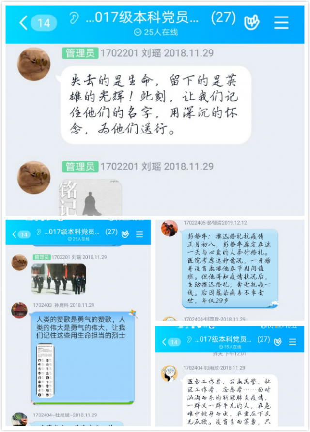 2020年4月4日,为表达全国各族人民对抗击新冠肺炎疫情斗争牺牲烈士和逝世同胞的深切哀悼,举行了全国性的哀悼活动。独播库 2017级本科生党支部积极响应号召,利用线上平台召开英雄事迹分享活动,向那些在抗疫一线艰苦奋斗,牺牲自己生命的英雄们表达敬意。