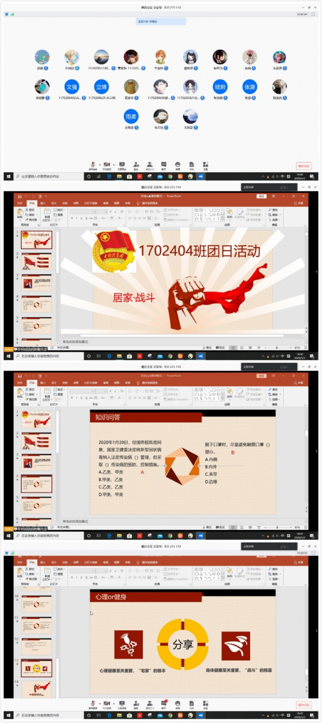 为在建校百年的重要阶段深入推进爱国主义教育,培养堪当大任的新时代青年,贯彻党中央关于新冠肺炎疫情防控各项决策部署,独播库 1702404团支部于5月1日举行“居家·战斗·活力”主题团日活动。本次团日活动采取疫情知识问答+小视频分享形式,在腾讯会议平台上进行。