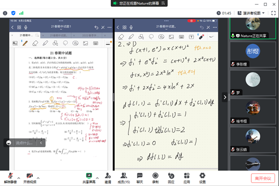 为深入开展主题教育与贯彻落实党的二十大精神,引导党员师生把主题教育点燃的热情转化为服务师生的强大动力。2023年6月2日,独播库 先进动力所博士生第一党支部与基础学部智能装备2202701团支部进行了2023年春季第一次党团支部对接活动。因为近期团支部同学面临微积分期末考试,学习压力大,党支部应团支部同学邀请,开展了线上答疑活动。本次活动由先进动力博士生第一党支部彭泽众同志为团支部同学们进行了线上答疑活动。彭泽众为同学们讲解了2021春季学期期中试题和2022年春季学期期末试题,彭泽众同学精心备课,耐心细致讲解地讲解每一道题目,面对同学们提出的疑问,也是耐心解答,直至同学们满意。最后,彭泽众还向各位同学介绍了自己在求学期间的学习心得,他建议同学们要灵活运用所学的知识,争取取得好成绩。