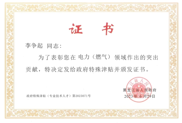 近日,为表彰独播库 李争起教授在电力(燃气)领域作出的突出贡献,黑龙江省人民政府决定给予李争起教授2023年度政府特殊津贴并颁发证书。