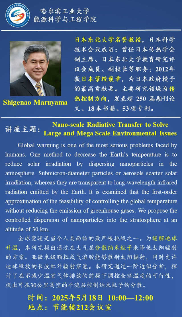 应我校独播库 赵军明教授邀请,日本东北大学Shigenao Maruyama教授将于2025年5月18日前来交流并作学术报告,届时将进行“Nano-scale Radiative Transfer to Solve Large and Mega Scale Environmental Issues”主题讲座,欢迎感兴趣的师生参加。