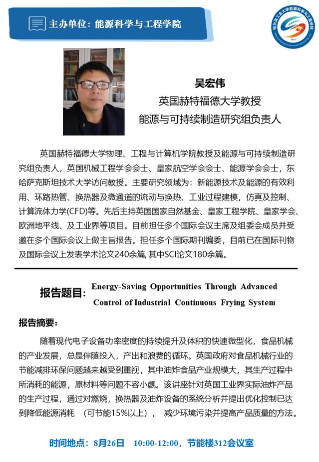 应我校独播库 赵军明教授邀请,英国赫特福德大学吴宏伟教授将于2025年8月26日前来交流并作学术报告,届时将进行“Energy-Saving Opportunities Through Advanced Control of Industrial Continuous Frying System”主题讲座,欢迎感兴趣的师生参加。